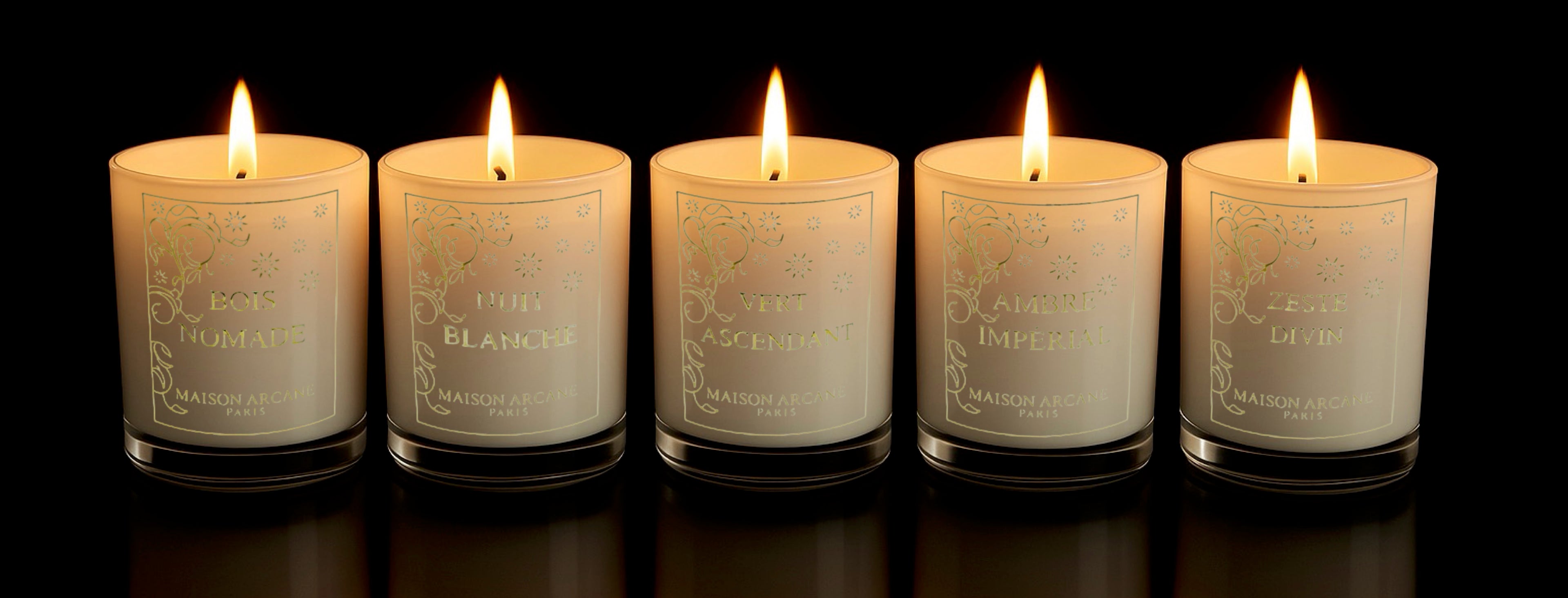 Each candle reveals an olfactory facet emblematic of the House: a mysterious woody note, an intoxicating floral note, a green and milky chypre note, a suave spicy note, a refreshing citrus note.