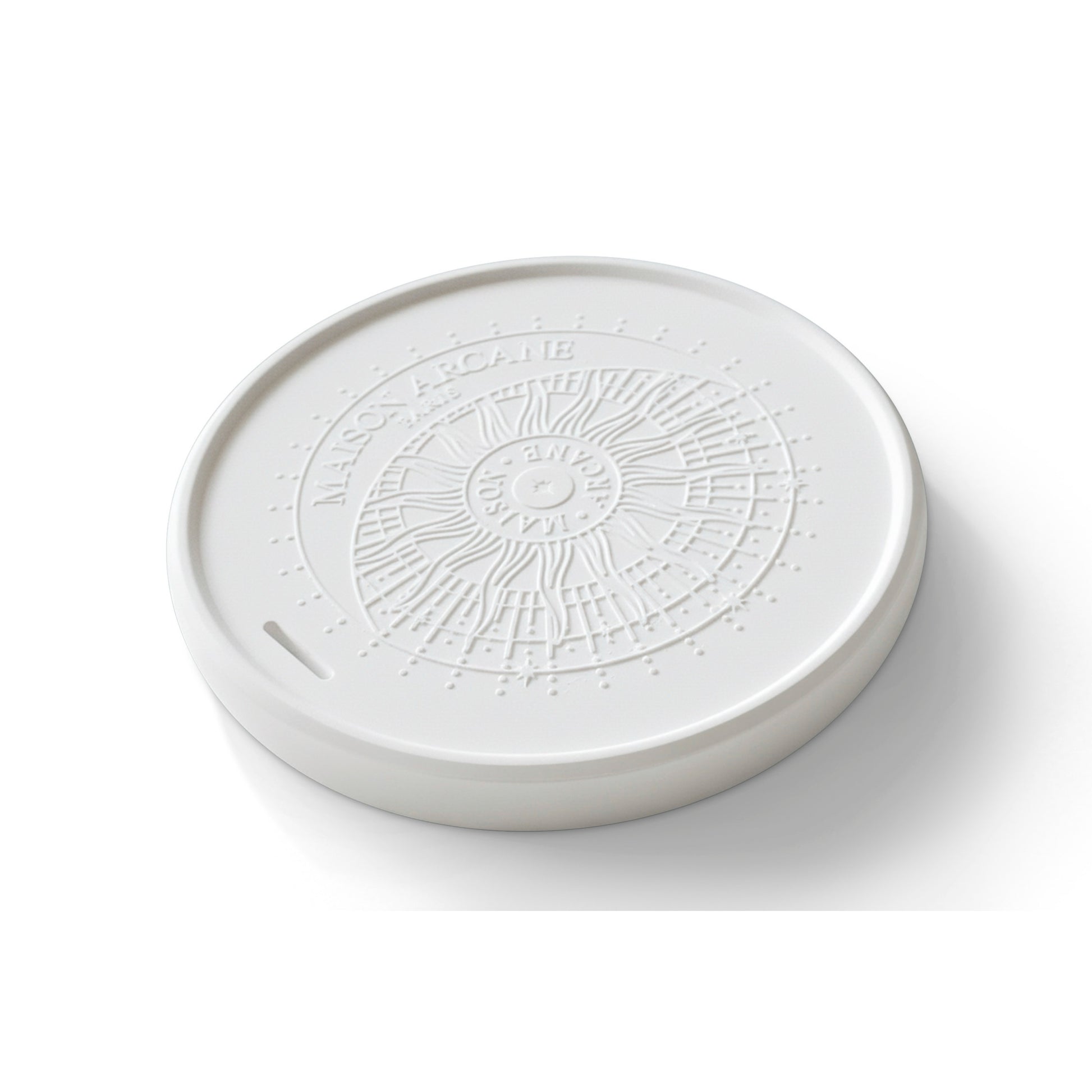 Sculpted from mineral-white gypsum, this diffusing stone embodies a rare elegance. Its raised floral motif evokes the refinement of ancient ornaments. Its porous surface retains the deposited essence and releases it in the hours to come. In the center, Maison Arcane, meticulously engraved, signifies the Maison's high standards.
