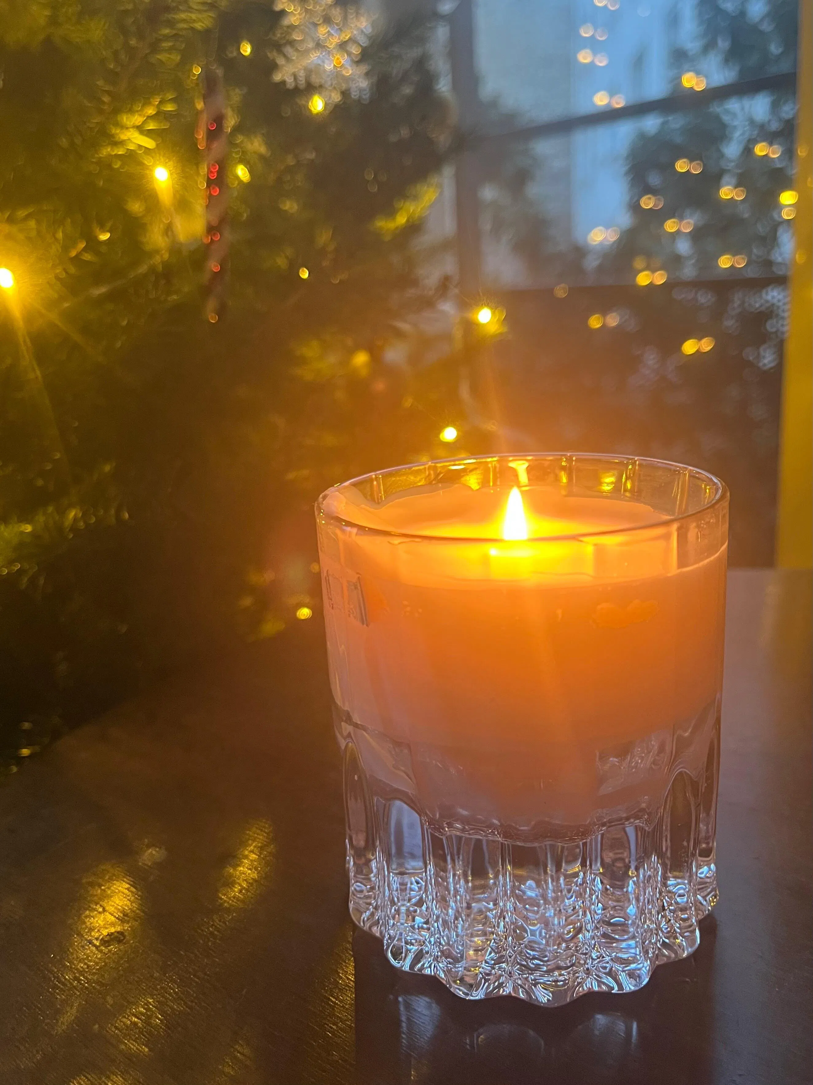 Ambre Impérial se dévoile dans un verre en cristal, précieux et réutilisable, où la lumière de la flamme vient sublimer son éclat.